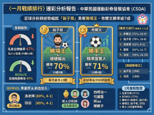 中華民國運動彩券發展協會(CSDA)正式公布1月份專家分析師戰績統計報告。本月賽事跨足 NBA、歐冠、英超等各大賽事,分析難度極高。協會整體「專家合牌制度」由團隊合議的「名家合牌」陷入小低潮,以 47% 勝率作收,是9個月以來勝率首度低於五成,不過分析師仍會持續精進,盼能為彩迷在新的一年奠定了穩健的獲利基礎。