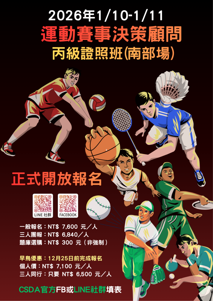 中華民國運動彩券發展協會(CSDA)宣布,115年度《運動賽事決策顧問 丙級證照班》將於2026年1月10日(六)、11日(日)正式在台南市開課!這不僅是課程首次南下,更是全台唯一通過 TTQS訓練品質管理系統(訓練機構版)評核的專業證照,現已全面開放報名!