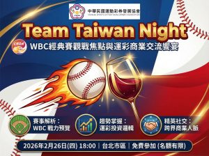 為了讓球迷與投資者能以更具深度的視角參與這場棒球盛事,中華民國運動彩券發展協會(CSDA)宣布,將於2月26日(週四)晚間舉辦一場結合賽事解析、運彩投資與商業交流的免費專屬講座——「Team Taiwan Night